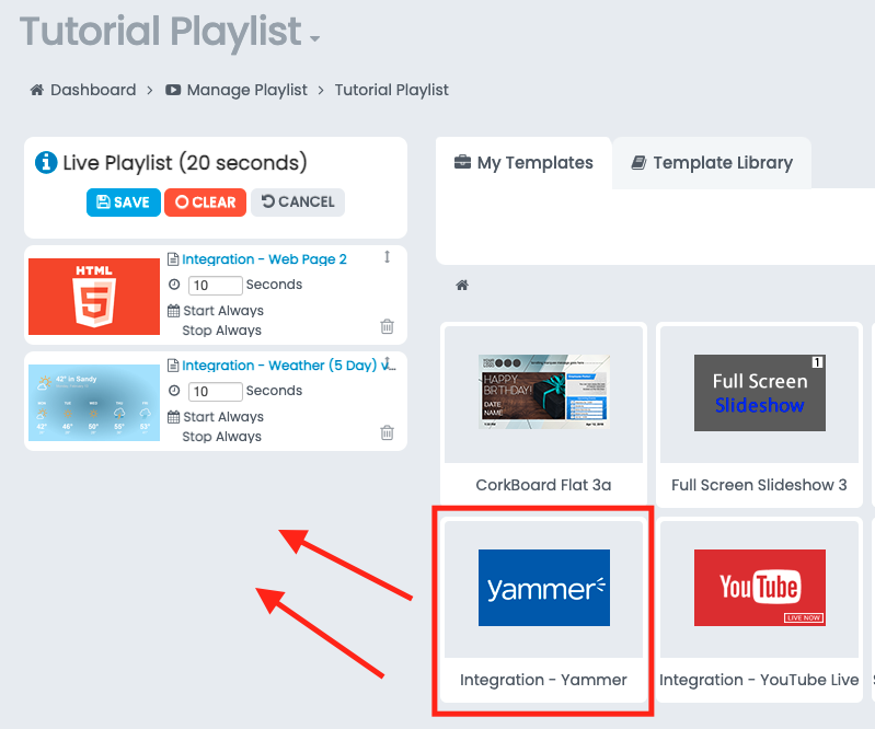 Step 9: Drag the Yammer Template from My Templates over to the Live Playlist