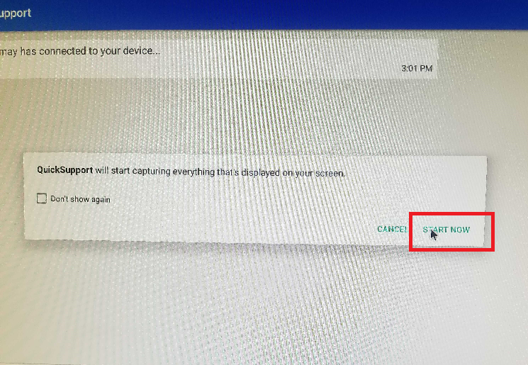 Select ALLOW and then START NOW to start the session. From there, the agent should be able to see your screen and continue to troubleshoot from there.