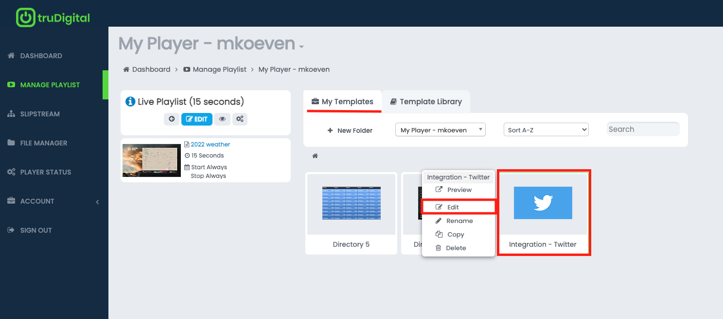 Step 5 - Once installed, you will be brought back to the My Templates tab and the Integration -Twitter template listed, click on the Twitter integration and select "Edit"