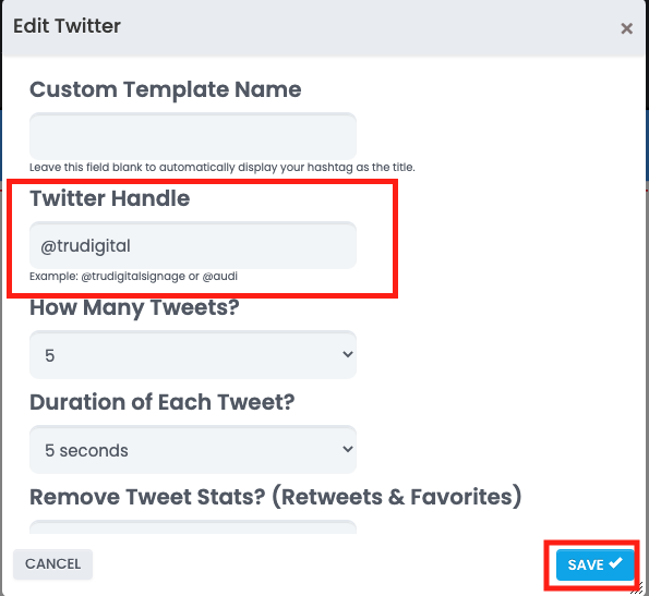 Step 9 - Enter your Twitter Handle as well as adjust any settings for the template then select "Save"
