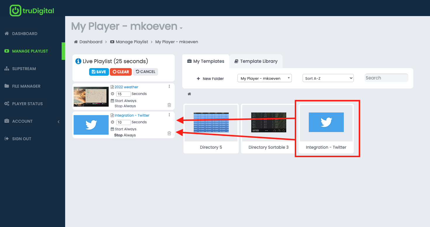 Step 13 - Click and drag your Twitter Integration template over to the left so it is under the Live Playlist