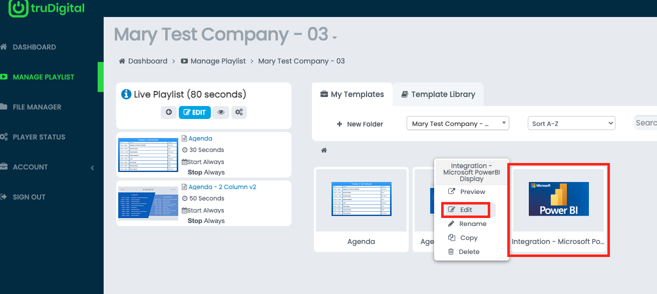 Step 4 - click on the template "Integration - Microsoft PowerBI Display" and select Edit