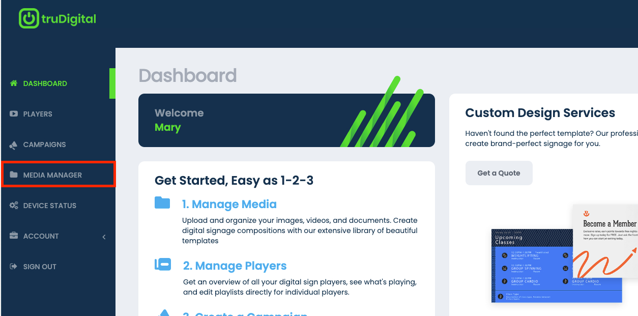 Step 1 - From your Dashboard, click "Media Manager" on the left